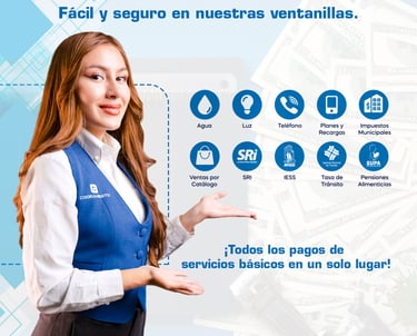 Realizar todos tus pagos de Luz, Agua, Internet, Municipio, Recargas, SRI,SUPRA,IESS, catálogos (ESIKA, AVON, YABAL).