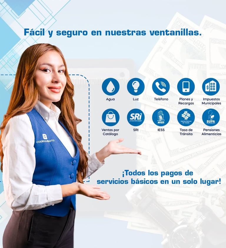 Con tu cuenta de ahorro COORAMBATO, puedes realizar transferencias de manera rápida y segura a bancos y cooperativas, tanto dentro como fuera de nuestra institución, a través del sistema financiero nacional respaldado por el Banco Central del Ecuador.